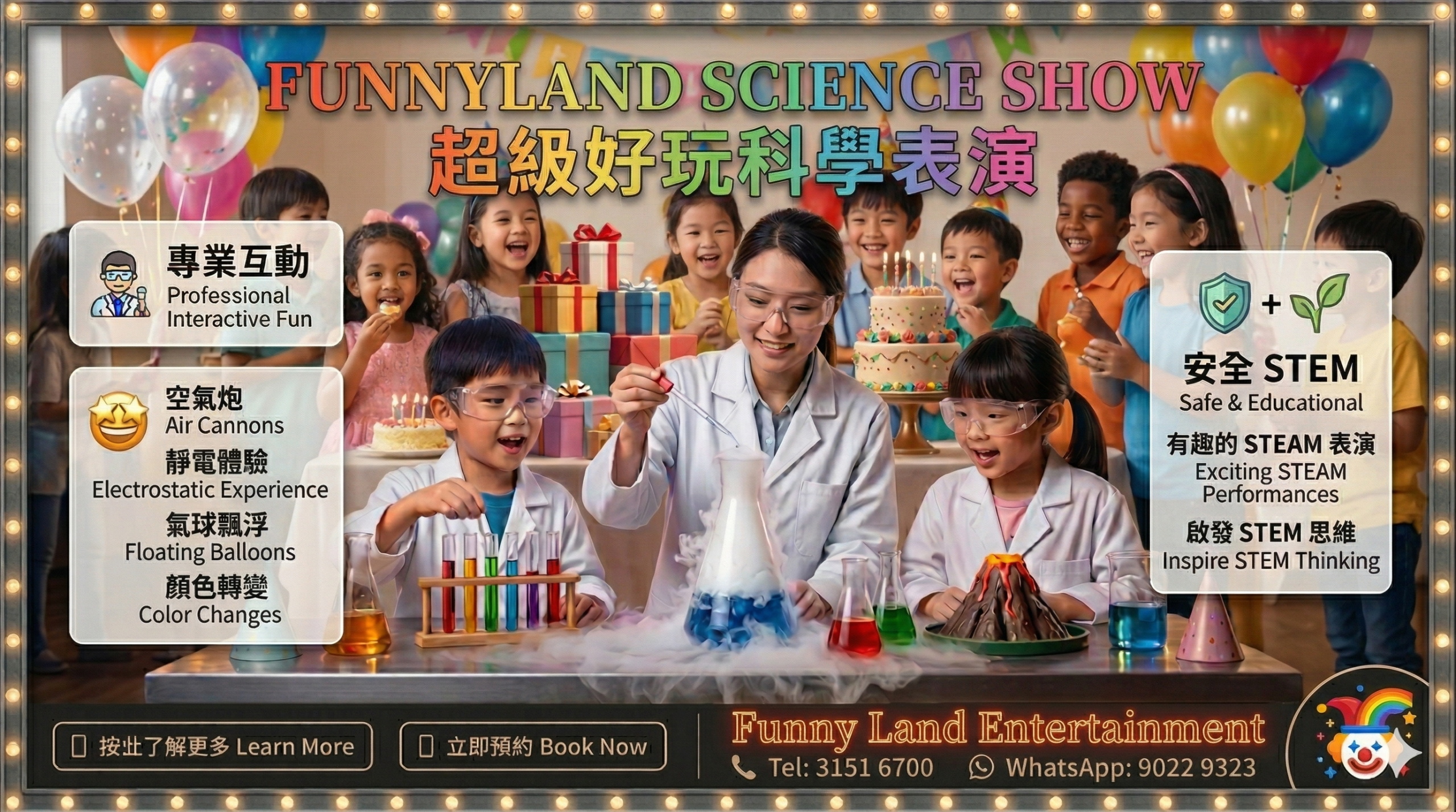 Funny Land Entertainment 提供專業又好玩的 🧪 Science Show 科學表演 服務,讓小朋友一秒化身小小科學家,親身感受神奇又有趣的科學魔法,為生日會、學校活動或商場推廣即時增添歡樂同驚喜氣氛!🎉