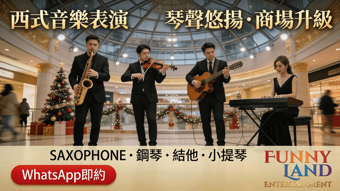 Funny Land Entertainment 提供專業又迷人的西樂弦樂四重奏服務!🎹 小提琴、鋼琴、結他、薩克斯風🎵,讓會所🏨、商場🛍️、酒店🎪即時升級國際格調,為VIP酒會💼、企業年會📈或婚禮典禮💒增添浪漫驚喜!