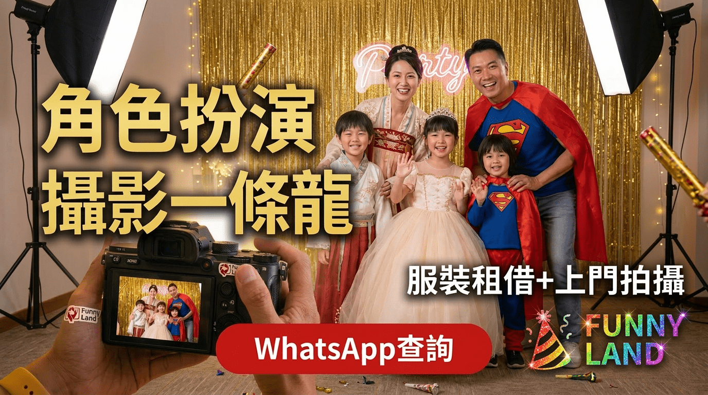 Funny Land Entertainment 提供一條龍角色扮演體驗,服裝租借 + 專業攝影,讓大人小朋友即場變身夢想角色!