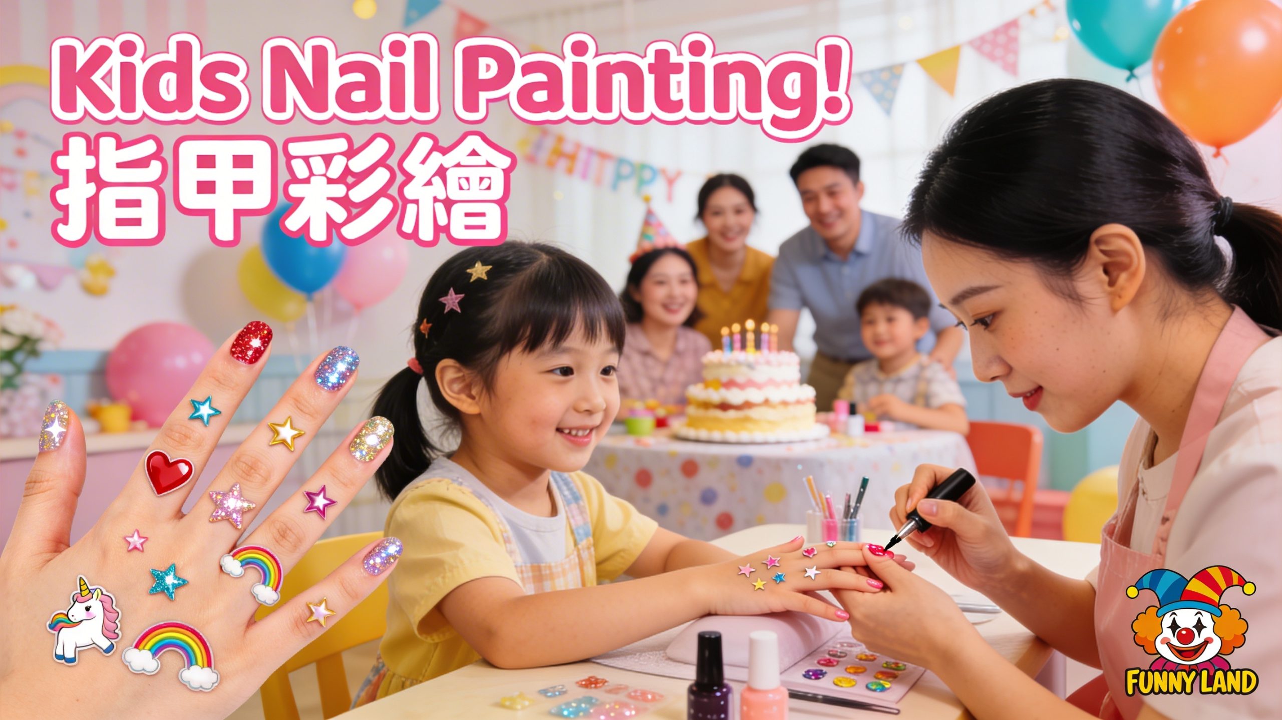 Funny Land Entertainment Nail Art Services, where our nail artists create sparkly and adorable nail art on-site for both kids and parents—a real eye-catcher for birthday parties and mall events!
